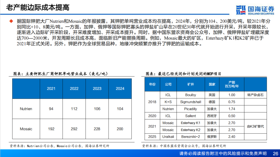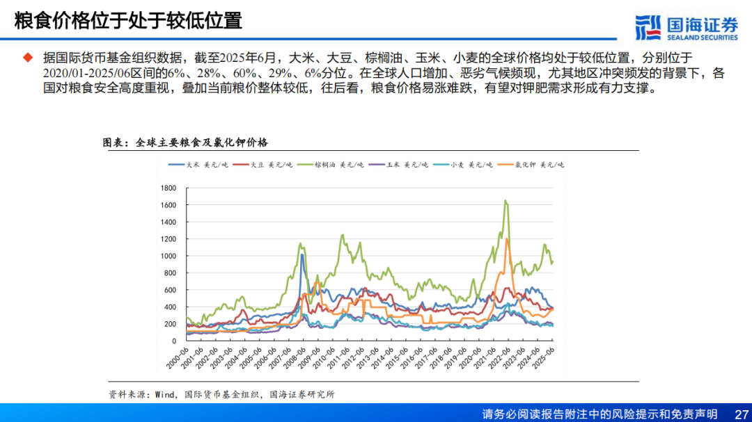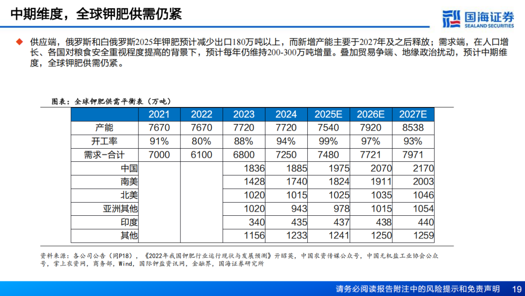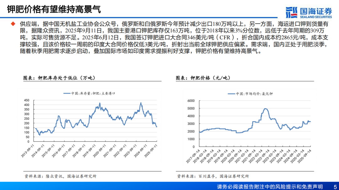 钾肥高景气中期有望持续。在人口增长、粮食安全问题关注度日益提升的背景下,2025-2027年,全球钾肥需求有望以3.2%的复合增速稳定增长。供给端,2026年底之前,全球钾肥新增产能有限,且海外主要新产能必和必拓单吨投资成本高,现有巨头老矿亦逐渐进入边际矿开采阶段,开采难度增加、开采成本提升。预计全球钾肥高景气中期有望持续。短期看,供应端,据中国无机盐工业协会公众号,俄罗斯和白俄罗斯今年预计减少出口180万吨以上,另一方面,海运进口钾到货量有限,据隆众资讯,2025年9月11日,主要港口钾肥库存仅163万吨,位于2018年至今的3%分位数,远低于去年同期的309万吨,实际可售货源不足。6月12日,我国签订钾肥进口大合同346美元/吨(CFR),折合国内成本约2865元/吨,成本支撑较强,且该价格较一周前的印度大合同价格仅低3美元/吨,折射出当前全球钾肥供应偏紧。需求端,国内正处于用肥淡季,随着秋季用肥需求逐步启动,叠加国际市场如印度需求提振利好支撑,短期钾肥价格有望维持高景气。