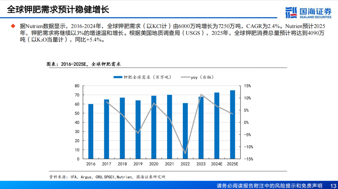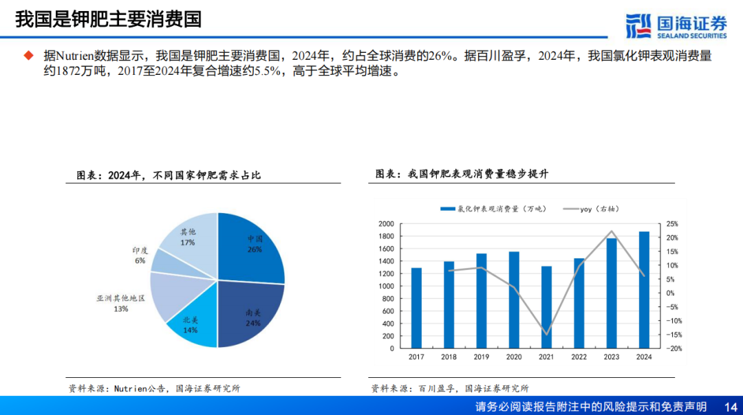 钾肥需求稳步提升。钾是农作物生长三大必需的营养元素之一,与氮肥和磷肥相比,钾肥的消费弹性更强。据Nutrien数据显示,2016-2024年,全球钾肥需求由6000万吨增长为7250万吨,CAGR为2.4%,预计2025年,钾肥需求将继续以3%的增速温和增长。我国是钾肥主要消费国,约占全球消费的26%。据百川盈孚,2024年,我国氯化钾表观消费量约1872万吨,2017至2024年复合增速约5.5%,高于全球平均增速。