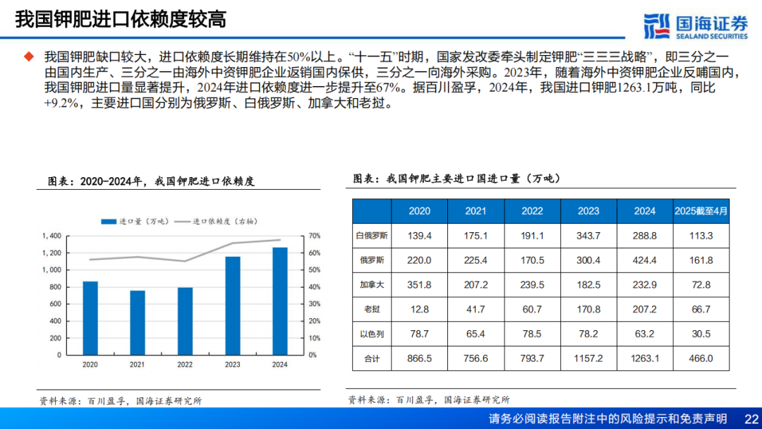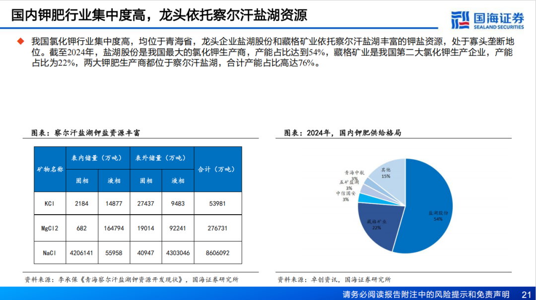 2026年前,全球钾肥新增产能有限。钾肥为资源垄断型行业,全球钾矿资源极不均衡,资源和产量主要分布在加拿大、俄罗斯、白俄罗斯及老挝地区。2024年,全球钾肥产能约7720万吨,拟建产能达2061万吨,但预计2026年前新增产能仅亚钾国际在老挝扩产的约200万吨。我国钾肥行业集中度高,均位于青海省,截至2024年,盐湖股份是我国最大的氯化钾生产商,产能占比达到54%。我国钾肥缺口较大,进口依赖度长期维持在50%以上,2024年大幅提高至67%。