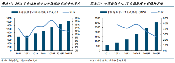 受益AI技术创新驱动算力需求激增、云计算基础设施扩张以及全球数据总量的爆发式增长,2024年全球数据中心市场规模首次突破千亿美元,达到1086.2亿美元,同比增长14.9%。其中,中国数据中心产业进入快速扩张阶段,科智咨询预测,预计到2026年,中国智算中心IT负载规模将超3000MW,产业潜力巨大,有望带动磁悬浮压缩机需求持续增长。