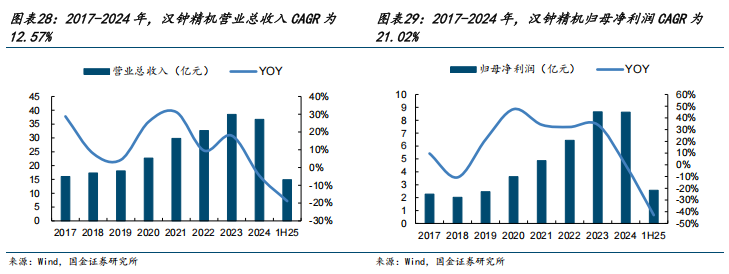汉钟精机收入长期稳健增长,磁悬浮压缩机有望带动公司收入增长提速。2017-2024年公司收入从16.04亿元提升到36.74亿元,CAGR为12.57%,归母净利润从2.27亿元提升到8.63亿元,CAGR为21.02%。其中2024年以来,公司收入、利润小幅下滑主要受光伏行业产能过剩影响,公司光伏真空泵短期承压。但考虑到公司在制冷压缩机领域的高成长性,公司未来总收入有望持续提升。