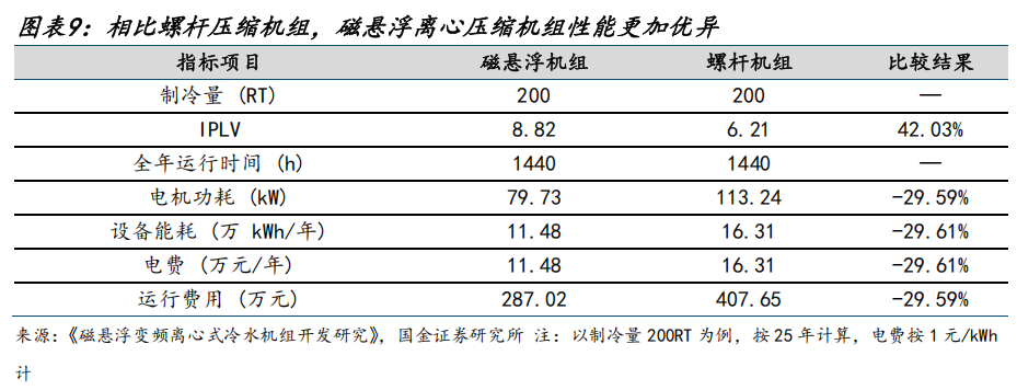 相比螺杆压缩机组,磁悬浮离心压缩机能效更高,运营费用更低,而且契合了我国对数据中心PUE降低至1.2的要求,未来在数据中心领域的渗透率有望持续提升。