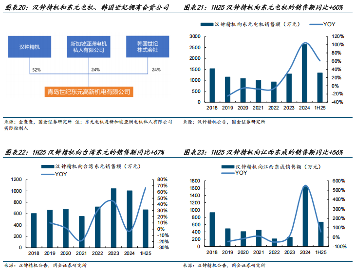 东元电机是公司制冷压缩机产品领域的客户,公司与其长期深度合作,并拥有合资公司青岛世纪东元。青岛世纪东元成立于2008年,汉钟精机、新加坡亚洲电机私人有限公司(东元电机是其实控人)、韩国世纪分别持股52%/24%/24%。公司向东元电机销售制冷压缩机,主要分为两部分,一是销售到台湾东元,另一个是销售到江西东成(东元电机在大陆的子公司)。当前,东元电机发力数据中心业务,有望带动公司数据中心用的制冷压缩机收入规模提升。1H25公司向东元电机关联交易金额1338万元,同比+60%。