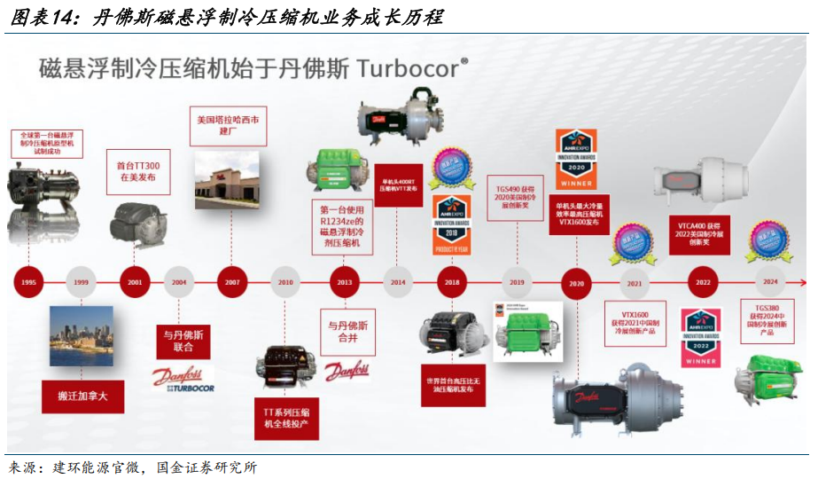 丹佛斯是全球磁悬浮制冷压缩机龙头,发展历史悠久。丹佛斯成立于1933年,是丹麦最大的工业集团,也是全球无油压缩机制造商及技术先驱,旗下品牌Turbocor早在1995年就成功试制出全球第一台磁悬浮制冷剂压缩机,至今已有30年的磁悬浮制冷压缩机的研发历史。