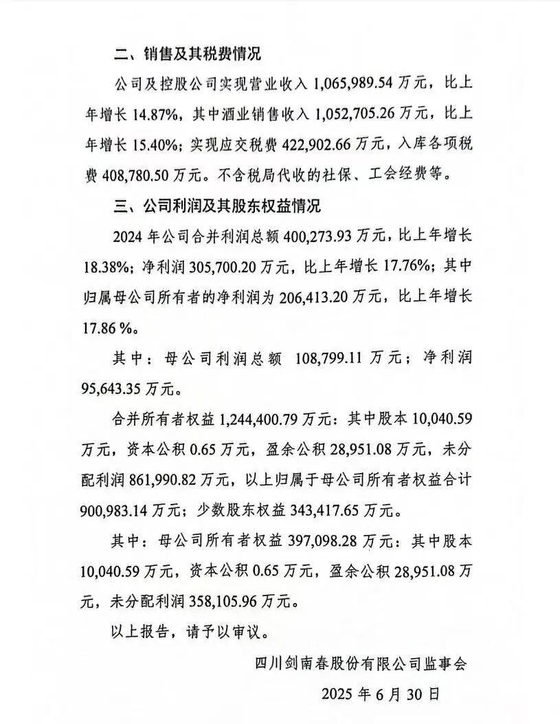 依靠核心大单品“水晶剑”,剑南春近年来业绩表现相对稳健,保持在百亿规模以上。酒业行业媒体此前曾曝出剑南春集团的核心子公司四川剑南春股份2024年财务数据。2024年,剑南春股份营收106.6亿元,其中酒业销售收入105亿元;合并净利30.57亿元,其中归母净利20.6亿元,母公司净利润9.56亿元。剑南春集团持有剑南春股份79.3837%股权。