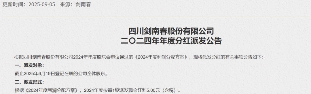 剑南春股份官网显示,去年12月及今年9月,公司两次宣布分红,每股派发的现金红利分别为30元、5元。按照约1亿总股本计算,这两次分红合计派发35亿元。
