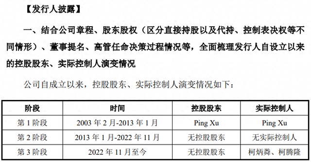 公开信息披露显示,优迅股份在2003年刚成立时,第一大股东为自然人Ping Xu。《审核问询函的回复》披露:发行人成立至2013年1月,控股股东、实际控制人为Ping Xu;2013年1月至2022年11月,无控股股东和实际控制人;2022年11月至今,无控股股东,实际控制人为柯炳粦、柯腾隆。