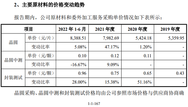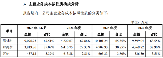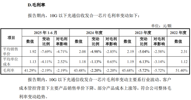 另据《审核问询函的回复》第143页披露的10G以下光通信收发合一芯片毛利率信息显示,2025年上半年的平均单位成本为1.13元/颗,相比2024年的1.18元/颗仅下降了4.11%。芯片产品的单位成本主要来自于晶圆和封测,其中封测单位成本在2025年上半年为0.28元/颗,相比2024年的0.29元/颗几乎无变化,则芯片产品单位成本下降的0.05元/颗主要来自于晶圆成本,降幅不到10%。