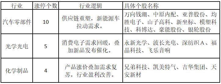 从行业特征来看,今日涨停板个股中,汽车零部件、光学光电、化学制品行业的个股最多。欢迎大家关注微信公众号“道达号”,“道达涨停复盘”栏目为大家复盘市场涨停数据。