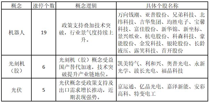 从概念特征来看,今日涨停板个股中,机器人、光刻机(胶)、光伏概念的个股最多。