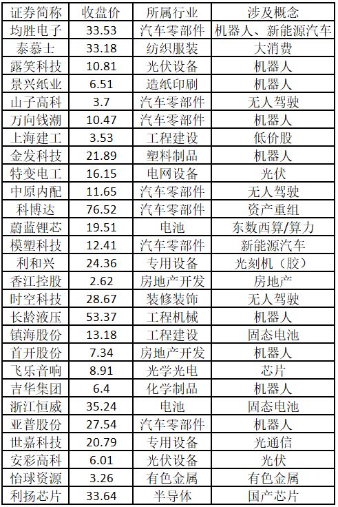 涨停板个股中,股价创出近一年新高的个股有27只(不包括创出历史新高的个股),包括均胜电子、泰慕士、露笑科技、景兴纸业、山子高科、万向钱潮、上海建工、金发科技、特变电工、中原内配、科博达、蔚蓝锂芯、模塑科技、利和兴、香江控股、时空科技、长龄液压、镇海股份、首开股份、飞乐音响、吉华集团、浙江恒威、亚普股份、世嘉科技、安彩高科、怡球资源、利扬芯片,具体如下表所示。