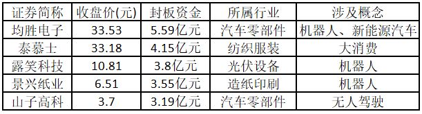 从封板资金来看,今日涨停板个股中,封板资金排名前5的个股包括均胜电子、泰慕士、露笑科技、景兴纸业、山子高科。