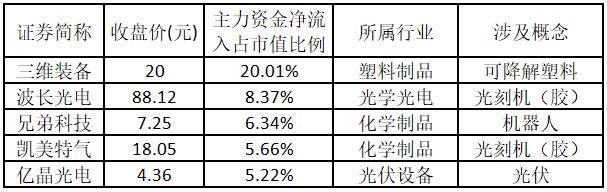 主力资金净流入金额占市值比例排名前5的个股分别为三维装备、波长光电、兄弟科技、凯美特气、亿晶光电。