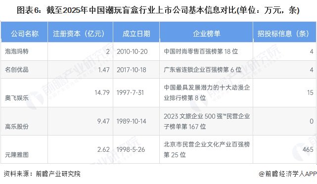 从潮玩盲盒行业的上市企业布局和已有公开信息分析,奥飞娱乐的注册资本最高、高乐股份成立时间最早,而招投标信息最多的则是元隆雅图。