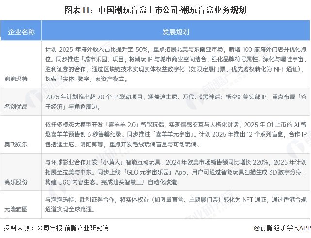 企业在潮玩盲盒领域的发展规划各有侧重,泡泡玛特聚焦海外市场拓展、“城市乐园”项目及“实体+数字”双资产模式;名创优品计划推出超90个IP联动项目;奥飞娱乐发力智能玩偶、元宇宙及多系列盲盒;高乐股份推进与环球影业合作、元宇宙乐园及工厂改造;元隆雅图则探索实体权益NFT通证化。