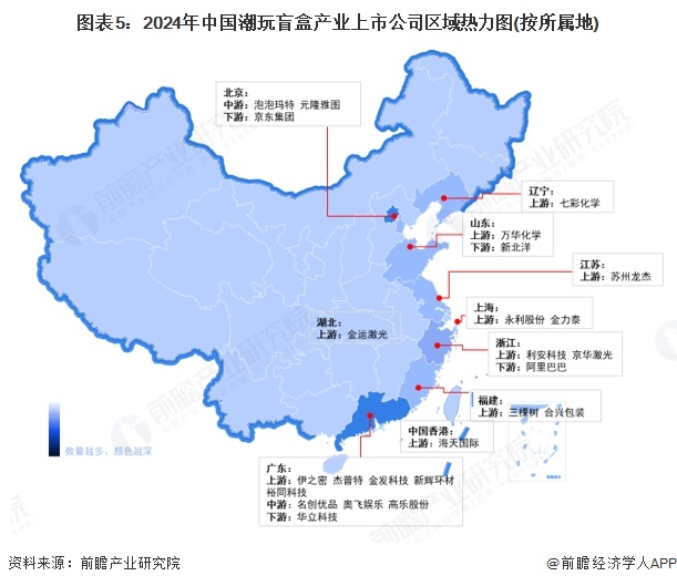 潮玩盲盒产业链的上市企业遍布中,上游产业主要集中在广东省地区,模具开发、注塑设备、智能设备、塑料与纤维材料等优势产业在广东省聚集;中游企业主要分布在北京市、广东省。