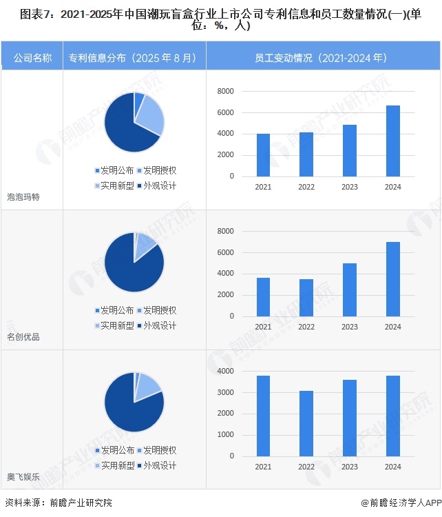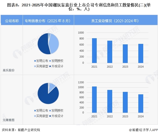 从潮玩盲盒行业的上市企业已有的公开信息分析,专利情况主要集中于外观设计,企业在外观设计的专利数量占比均超过50%。从员工数量变动情况来看,泡泡玛特、名创优品企业的员工数量逐年增长,奥飞娱乐则呈现波动态势,高乐股份、元隆雅图员工数量整体下跌。