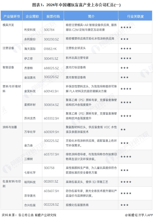 从潮玩盲盒行业的产业链来看,上游产业主要有模具开发、注塑设备、智能设备、塑料与纤维材料、涂料与油墨、包装材料与印刷等,中游为潮玩盲盒企业,代表上市企业有泡泡玛特、名创优品等,下游主要是销售渠道。产业链各个环节具体上市公司包括: