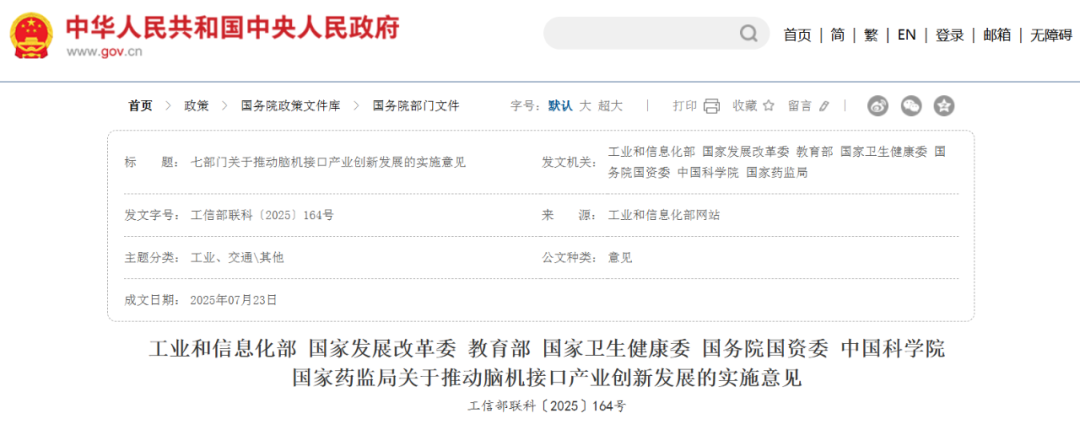 8月,工信部、国家发改委等七部门联合发布《关于推动脑机接口产业创新发展的实施意见》,锚定产业发展方向:明确2027年需突破脑机接口关键技术,为产业划定阶段性攻坚目标,从国家层面统筹资源推进技术转化。