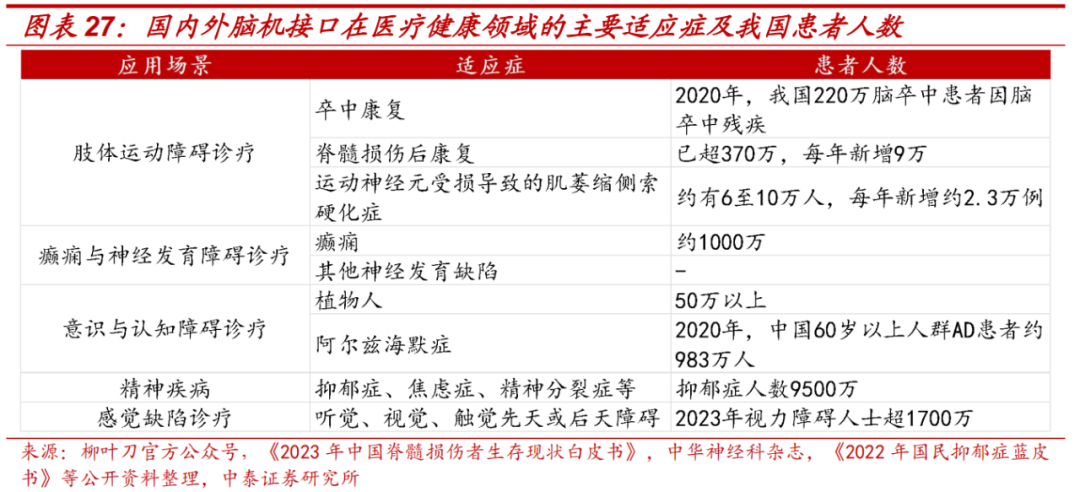 脑机接口(分为非浸入式、半侵入式、浸入式)的应用场景覆盖医疗、工业、消费等领域,但医疗健康是当前核心赛道——根据 MARKET RESEARCH FUTURE 预测,到2035年,全球脑机接口医疗应用市场规模将超65亿美元。目前,国内已在肢体运动障碍、癫痫、意识障碍、精神疾病、感觉缺陷五大领域实现突破。