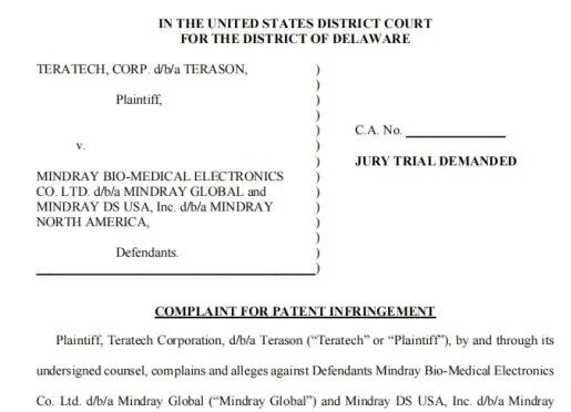 2025 年 9 月 15 日,美国特拉华州法院收到一份特殊的起诉状:本土企业 Teratech 以五项专利侵权为由,将曾经的 OEM 合作伙伴迈瑞生物及其美国子公司迈瑞 DS USA 告上法庭。