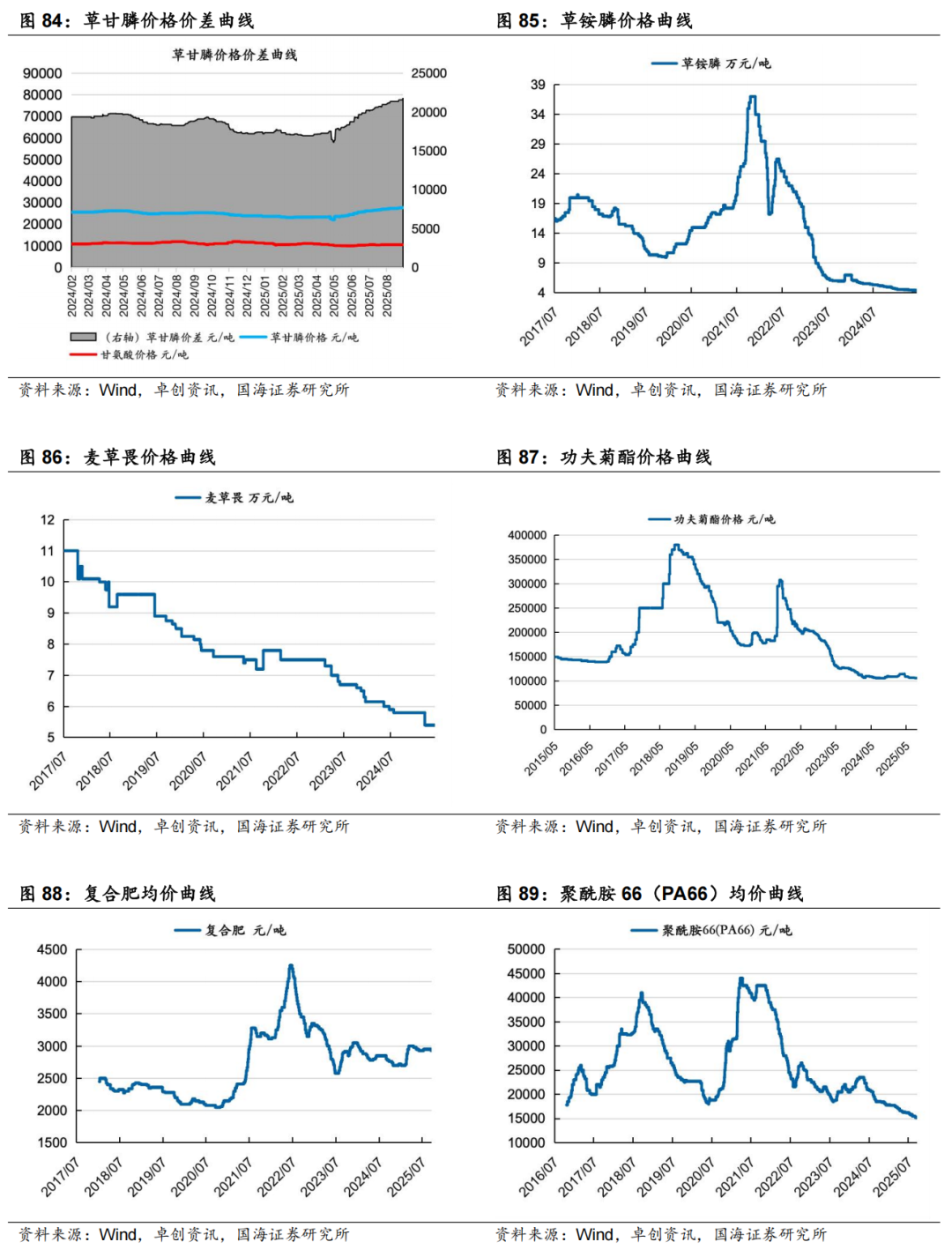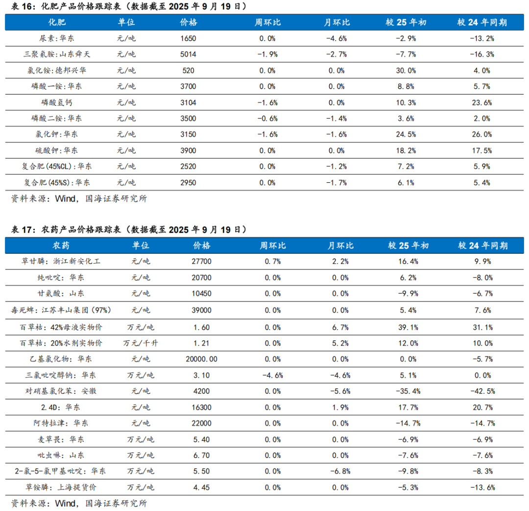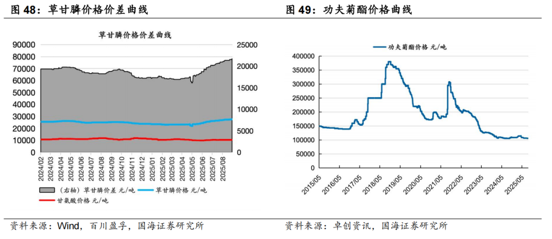 据Wind和百川盈孚,2025年9月19日功夫菊酯原药价格为10.7万元/吨,较9月12日持平;联苯菊酯原药价格为12.7万元/吨,较9月12日持平;草甘膦原药价格为2.77万元/吨,较9月12日上涨0.02万元/吨。