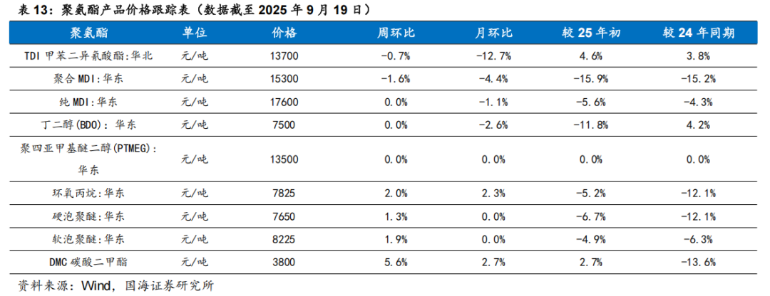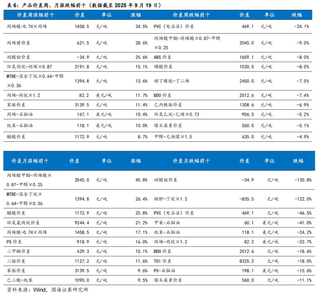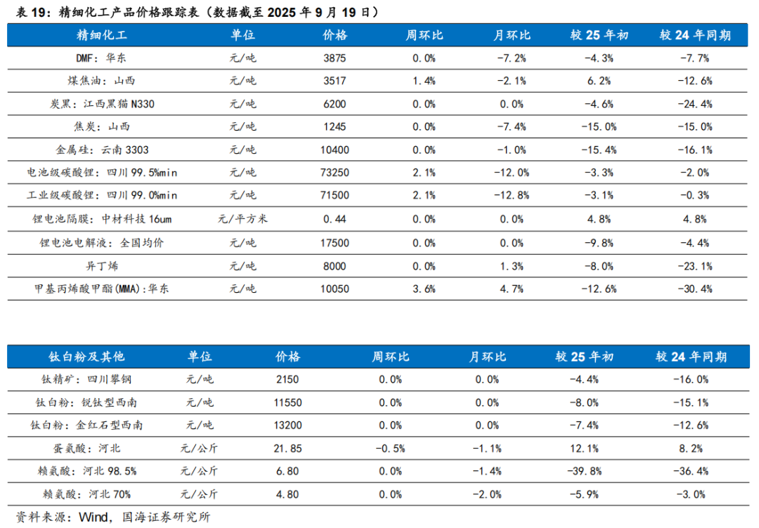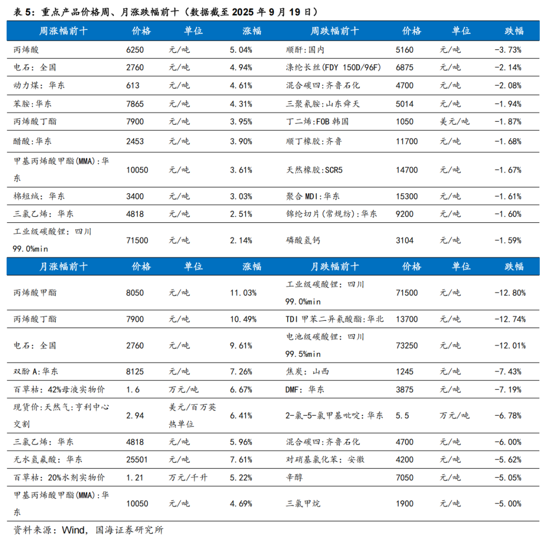 根据Wind,2025年9月19日顺酐价格为5100元/吨,环比9月12日下降100元/吨;据卓创资讯,2025年9月19日丁酮价格为6855元/吨,环比9月12日下降58元/吨。