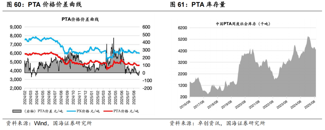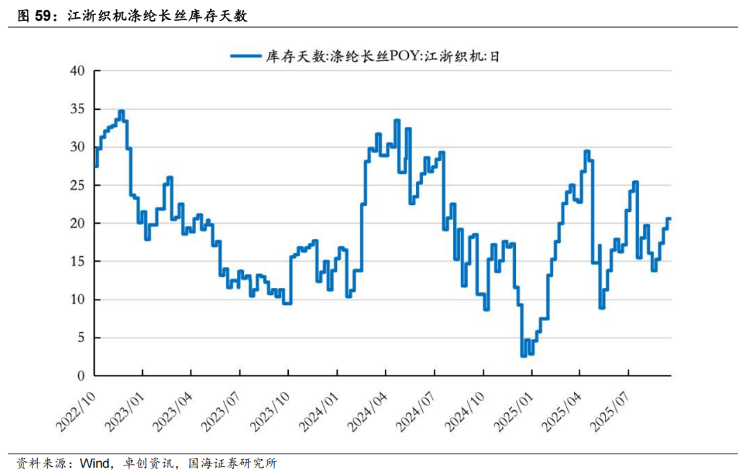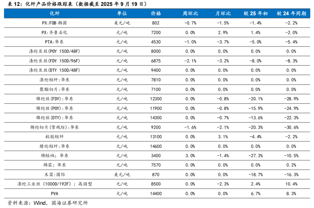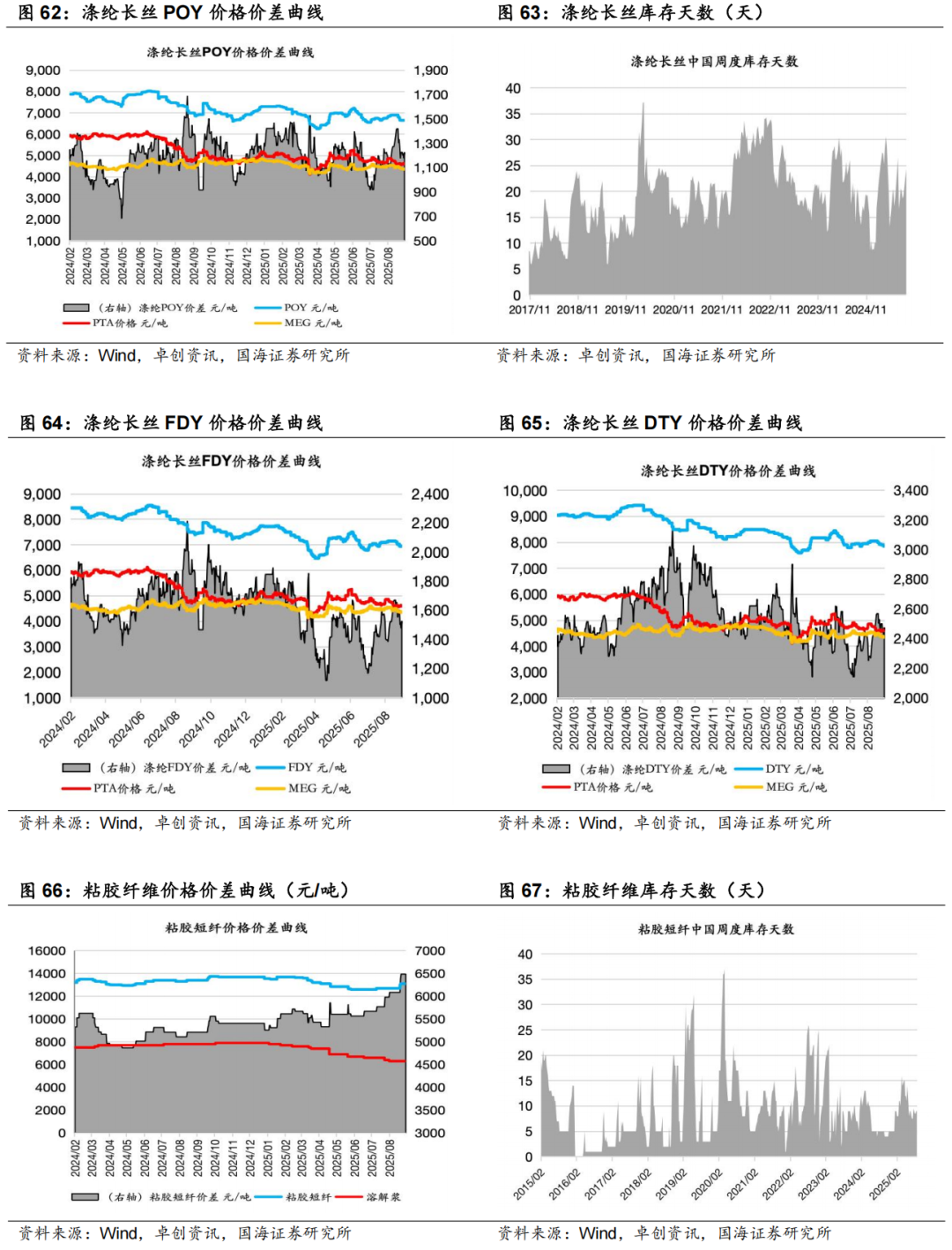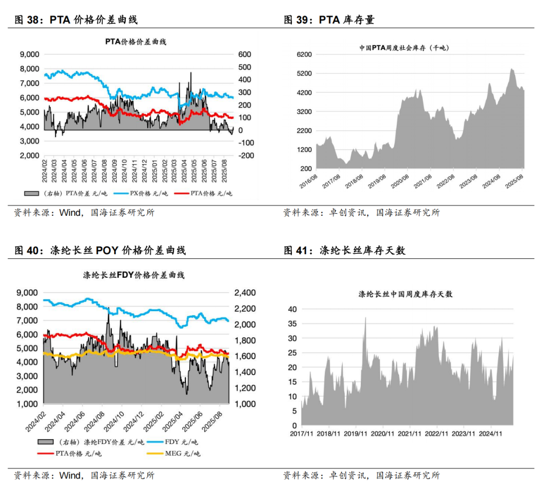 据Wind和卓创资讯,2025年9月18日涤纶长丝库存天数为24.3天,较9月11日上涨1.5天。2025年9月19日,PTA社会库存为433.2万吨,较9月12日上涨0.9万吨。涤纶长丝POY价格为6650元/吨,较9月12日下降75元/吨;PTA价格为4580元/吨,较9月12日上涨10元/吨。