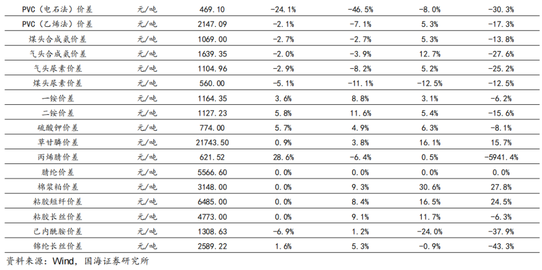 我们跟踪的171种产品的价格中,有35种上涨,占比20.47%,有43种产品下跌,占比25.15%。周涨幅前五的产品分别为:丙烯酸(5.04%)、丙烯酸(4.94%)、动力煤:华东(4.61%)、苯胺:华东(4.31%)、丙烯酸丁酯(3.95%)。周跌幅前五的产品分别为:顺酐:国内(-3.73%)、涤纶长丝(FDY 150D/96F)(-2.14%)、混合碳四:齐鲁石化(-2.08%)、三聚氰胺:山东舜天(-1.94%)、丁二烯:FOB韩国(-1.87%)。