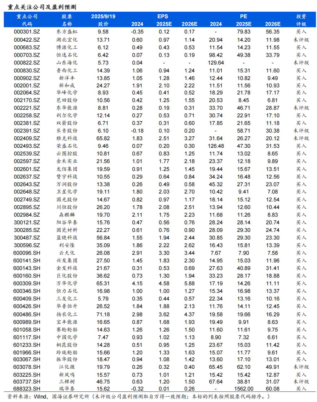 风险提示:宏观经济变化;油价震荡变化;环保趋严;产品价格大幅波动;重点关注公司业绩不达预期;中美财政政策不及预期;化工产品去库低于预期;AI数据中心建设和航空航天材料需求不及预期;全球经济增长的不确定性;磷矿石价格大幅下行;有机硅等行业原材料价格波动风险。