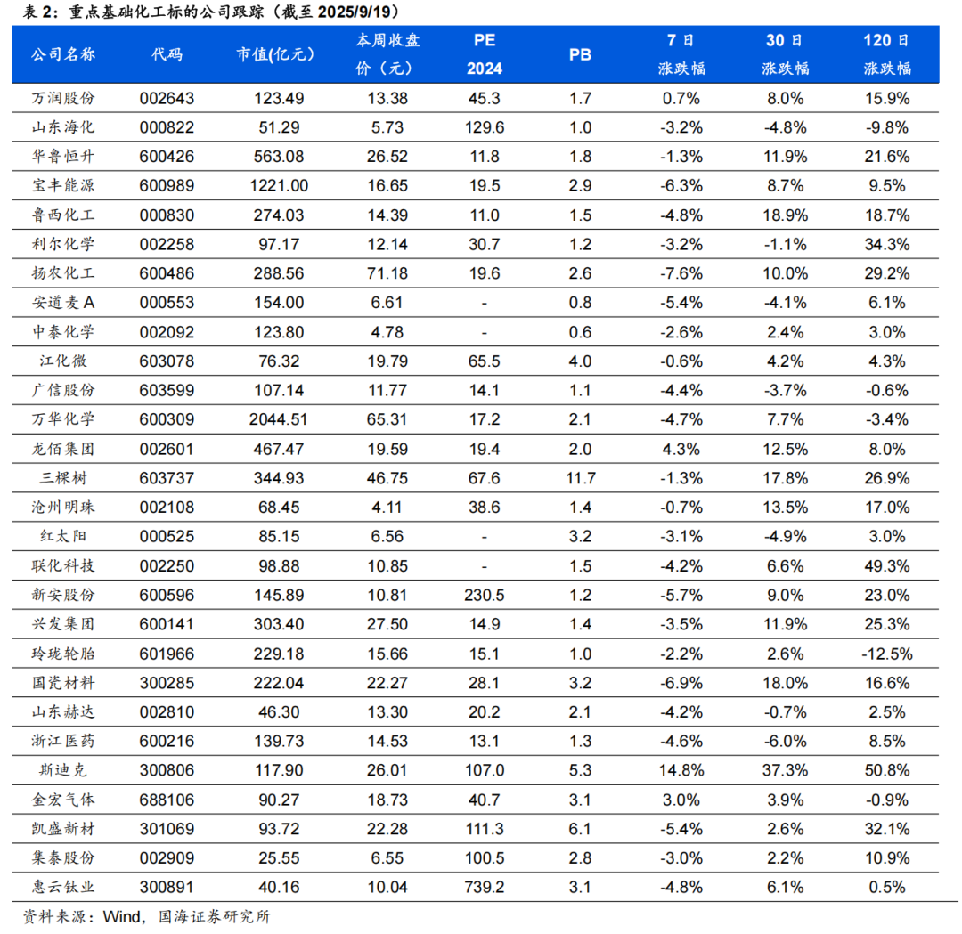 本周(2025年9月12日-9月19日,下同)上周基础化工(中信)指数涨跌幅为-0.95%,沪深300指数涨跌幅为-0.44%,基础化工跑输沪深300指数0.51%。年初至今,基础化工指数涨跌幅为26.97%,沪深300指数涨跌幅为14.41%,基础化工指数跑赢沪深300指数12.56%。