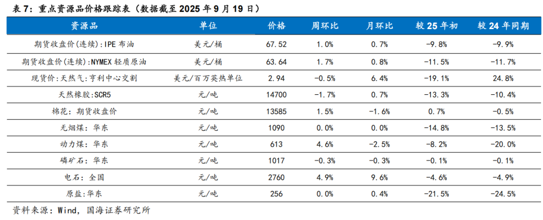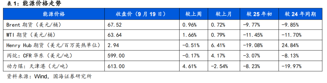 据Wind,截至9月19日,Brent和WTI期货价格分别收于67.52和63.64美元/桶,周环比0.96%和1.66%。