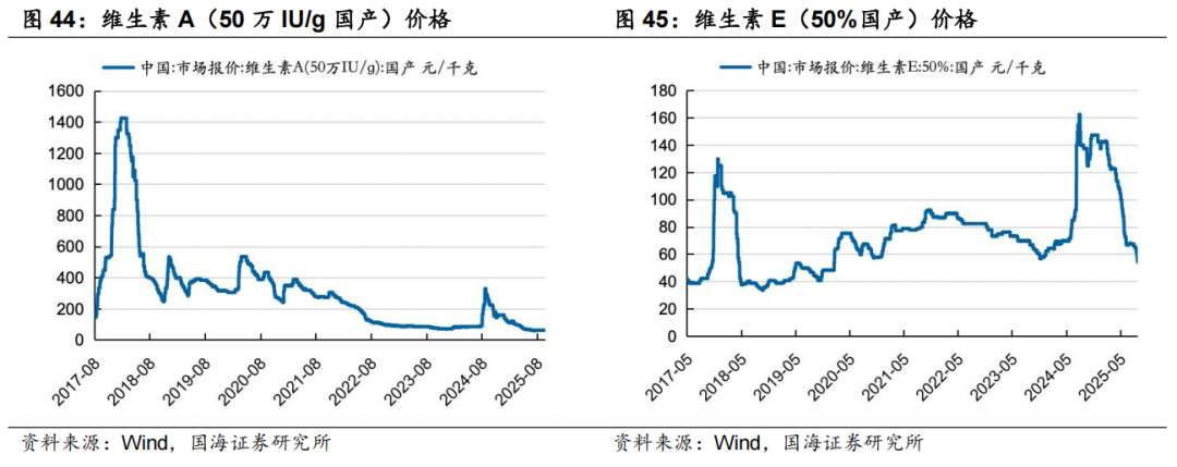 据Wind,2025年9月19日,维生素A价格为63.00元/千克,环比9月12日持平;维生素E价格为54.50元/千克,环比9月12日下降6元/千克。