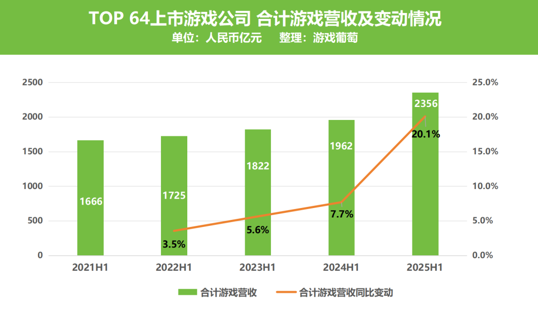 如果统一用TOP 64上市公司的业绩总和来看,你会发现自2021H1以来,它们的合计游戏收入持续增长,且今年首次突破2000亿元和20%增速的大关;