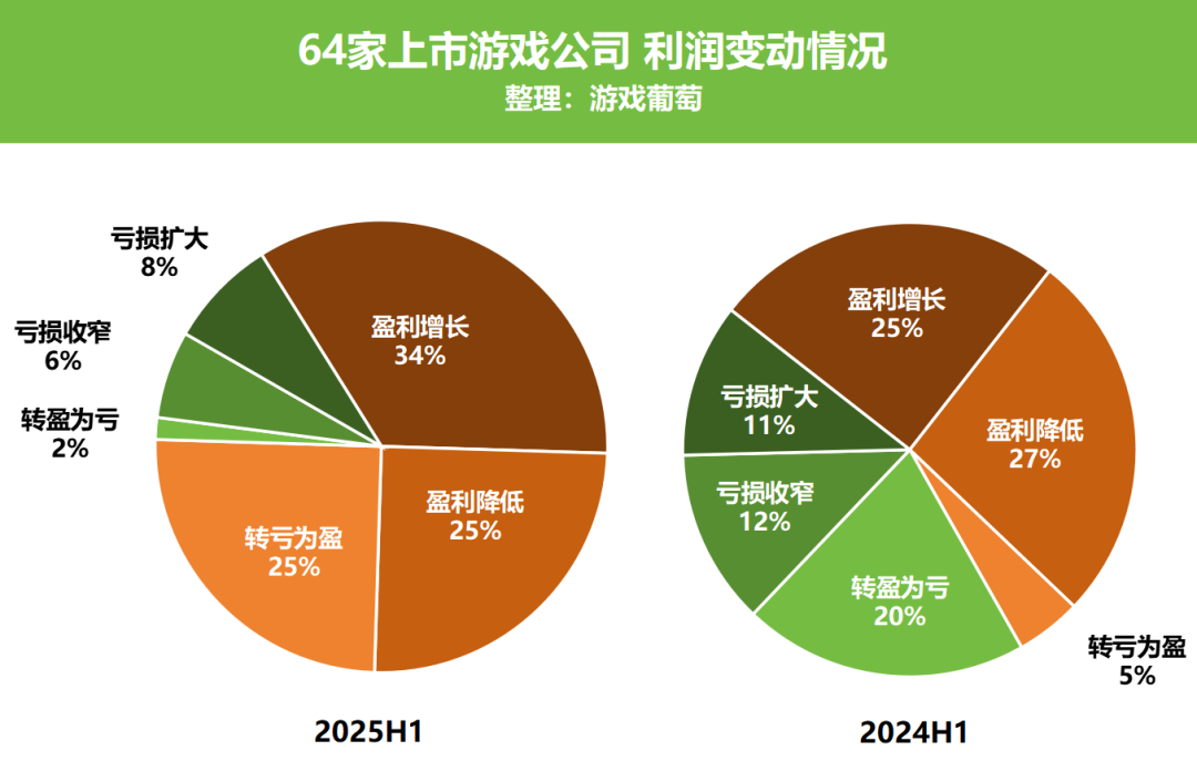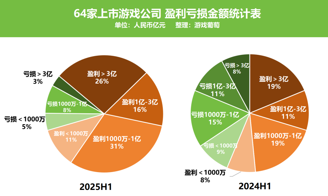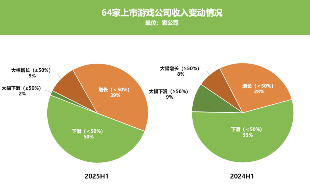 营收增长方面,48%的公司游戏收入实现增长,较去年同期的36%有所提升;大幅下滑(≥50%)的公司数量占比,也从9%收窄至2%(仅一家)。