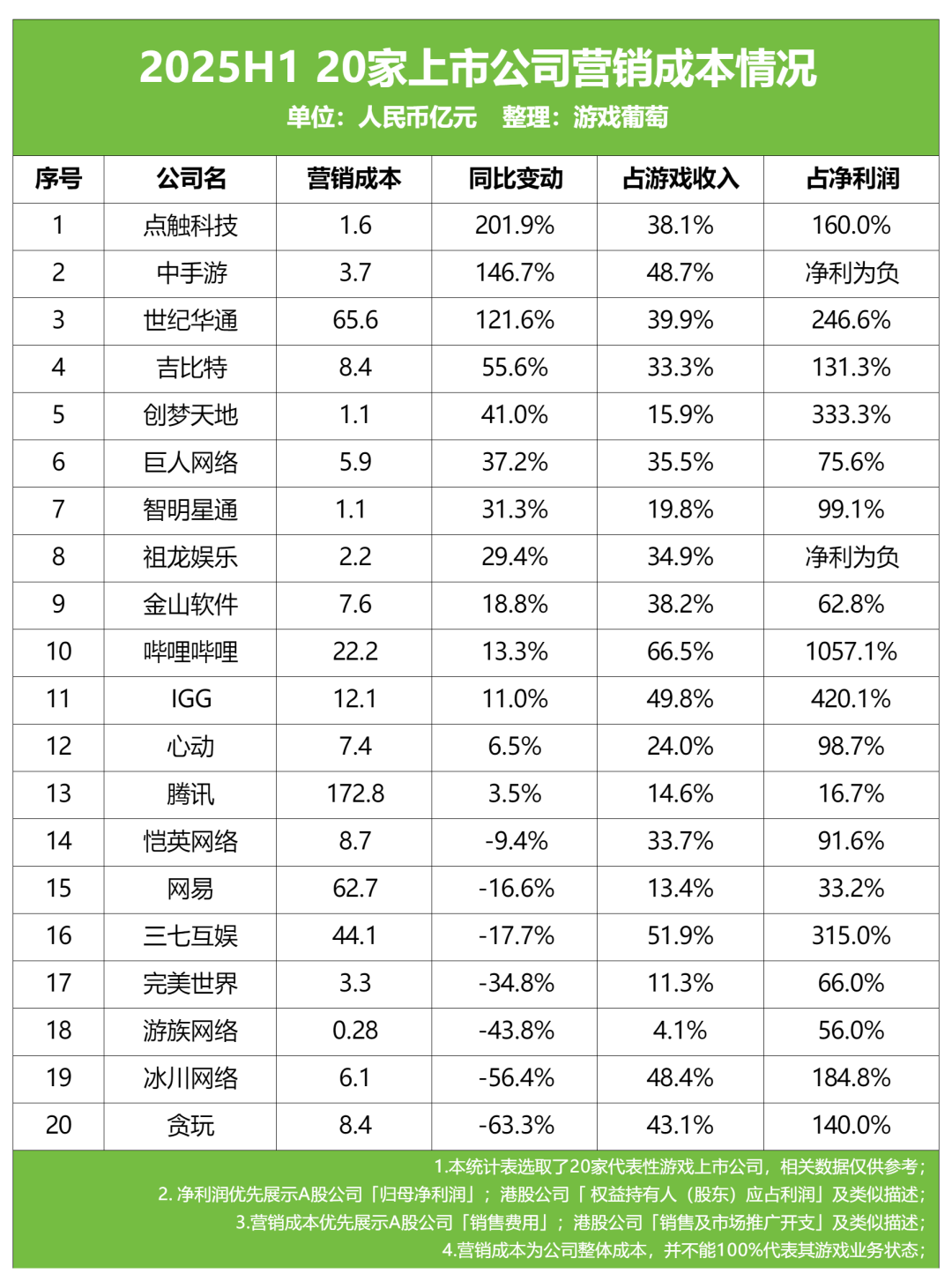 可以说,大部分营销费用增长的厂商,诸如点触科技、世纪华通、吉比特(《杖剑传说》)、创梦天地(《卡拉彼丘》)、心动等,都能通过营销收入换来可观回报;而更多如网易、三七互娱、哔哩哔哩、恺英网络、完美世界、冰川网络等厂商,则在控制营销成本的同时,保持了业绩的平稳增长。