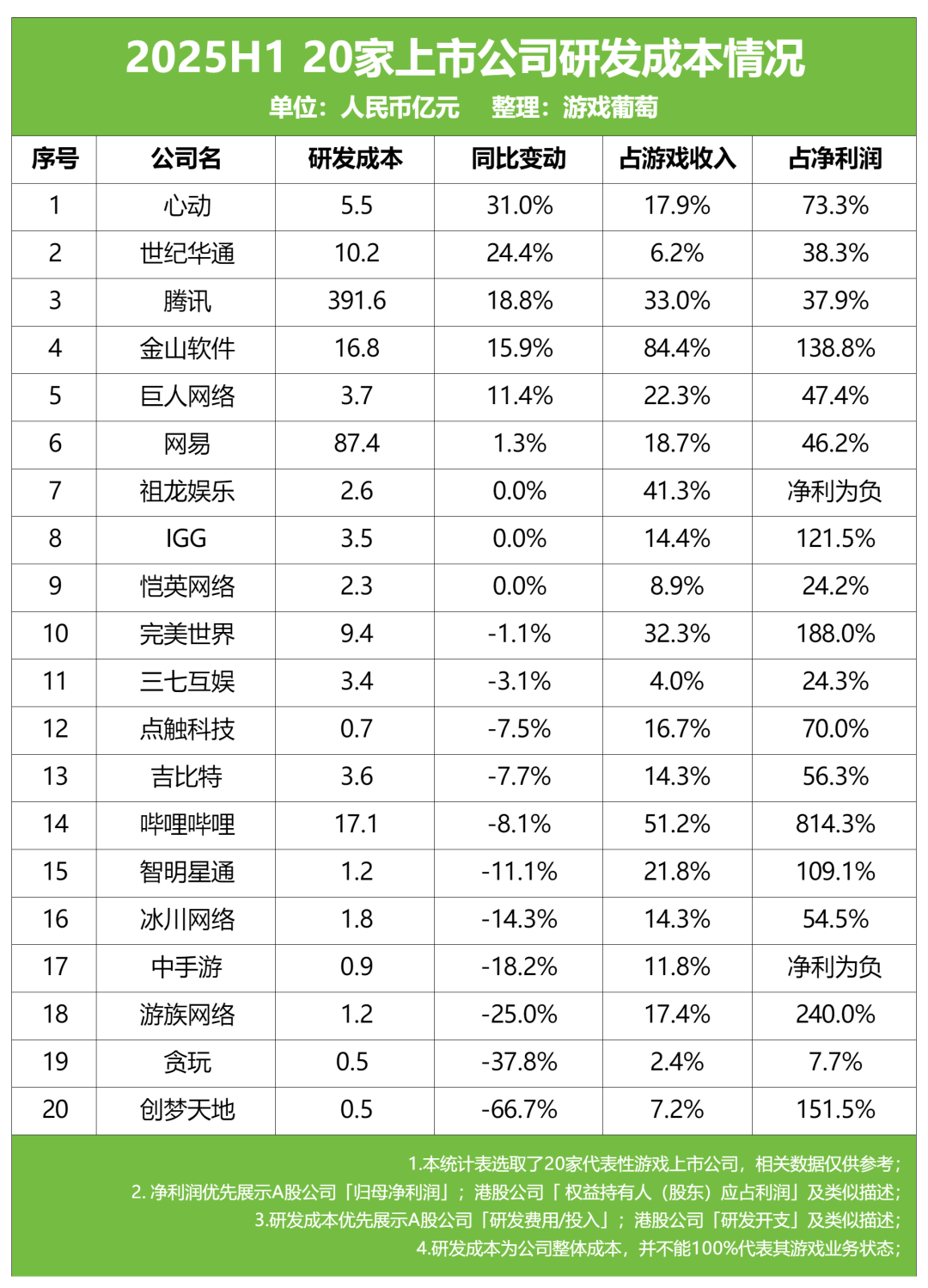 研发成本在游戏业务方面,反映为对在研、在运营产品的持续投入。统计数据显示,绝大部分厂商严格控制研发预算,成本增幅最大的心动仅增长31%,其次为世纪华通的24%,腾讯的19%;