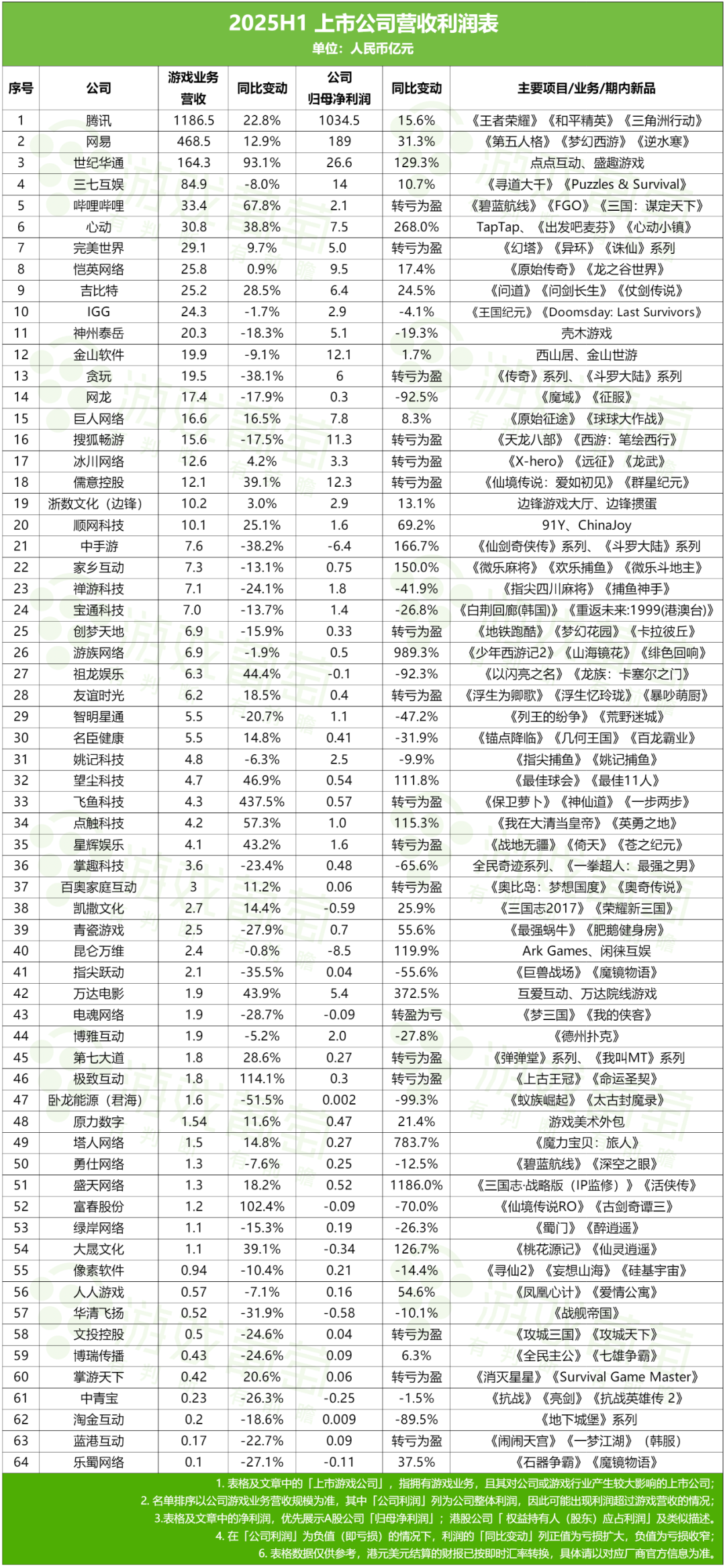 先声明一下,游戏行业的发展不能单以增长思维衡量,短期的账面表现受多种因素影响,未必能真实反映公司的持续营收能力;表格及本文所称的「上市游戏公司」,指游戏业务占比较高、对行业有显著影响的上市公司。