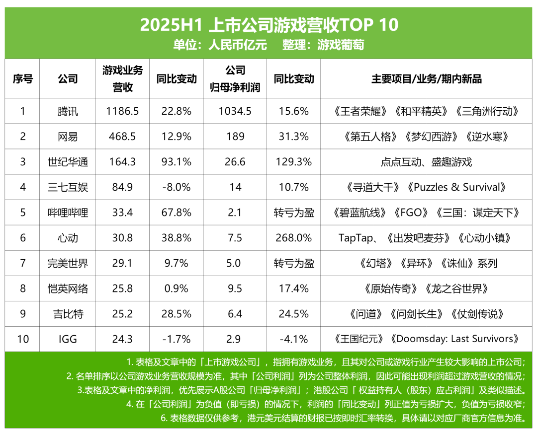游戏营收TOP 10的厂商中,除三七互娱(第4名)和IGG(第10名)保持相对平稳外,腾讯、网易、世纪华通、哔哩哔哩、心动、完美世界、恺英网络、吉比特均实现了营收与利润的双增长。