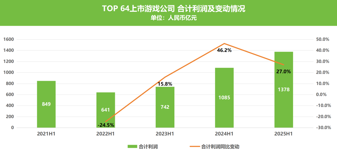 从整体市场来看,64家上市游戏公司H1业绩显示,超八成公司实现盈利,近半数公司游戏业务收入增长,16家公司扭亏为盈……TOP 64的上市公司游戏营收、利润的总和,也来到了近五年的最高点;