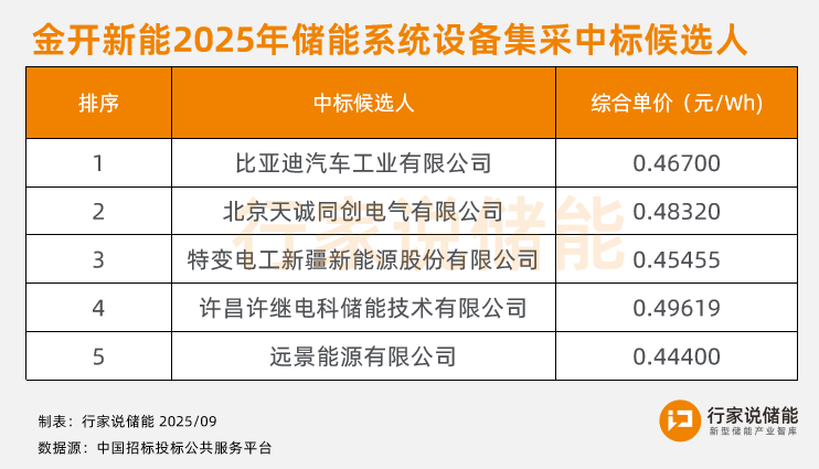 9月22日,金开新能科技有限公司2025年储能系统设备集中采购项目中标候选人 (入围供应商)公示,比亚迪、天诚同创、特变电工新能源、许继电科储能、远景能源入围,报价范围处于0.444-0.49619元/Wh。其中,北京天诚同创电气有限公司为新疆金风科技股份有限公司全资子公司。