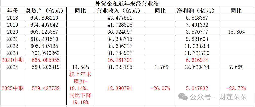 在2023年吸收合并中车金租后的中国外贸金融租赁有限公司(下称“外贸金租”)资产规模一度达到701.64亿元,但在不断压降回租比例下,2024年其资产规模回落至589.21亿元,而2025年上半年,该公司资产规模继续“瘦身”到529.44亿元,营业收入和净利润也双双下滑超过20%以上。