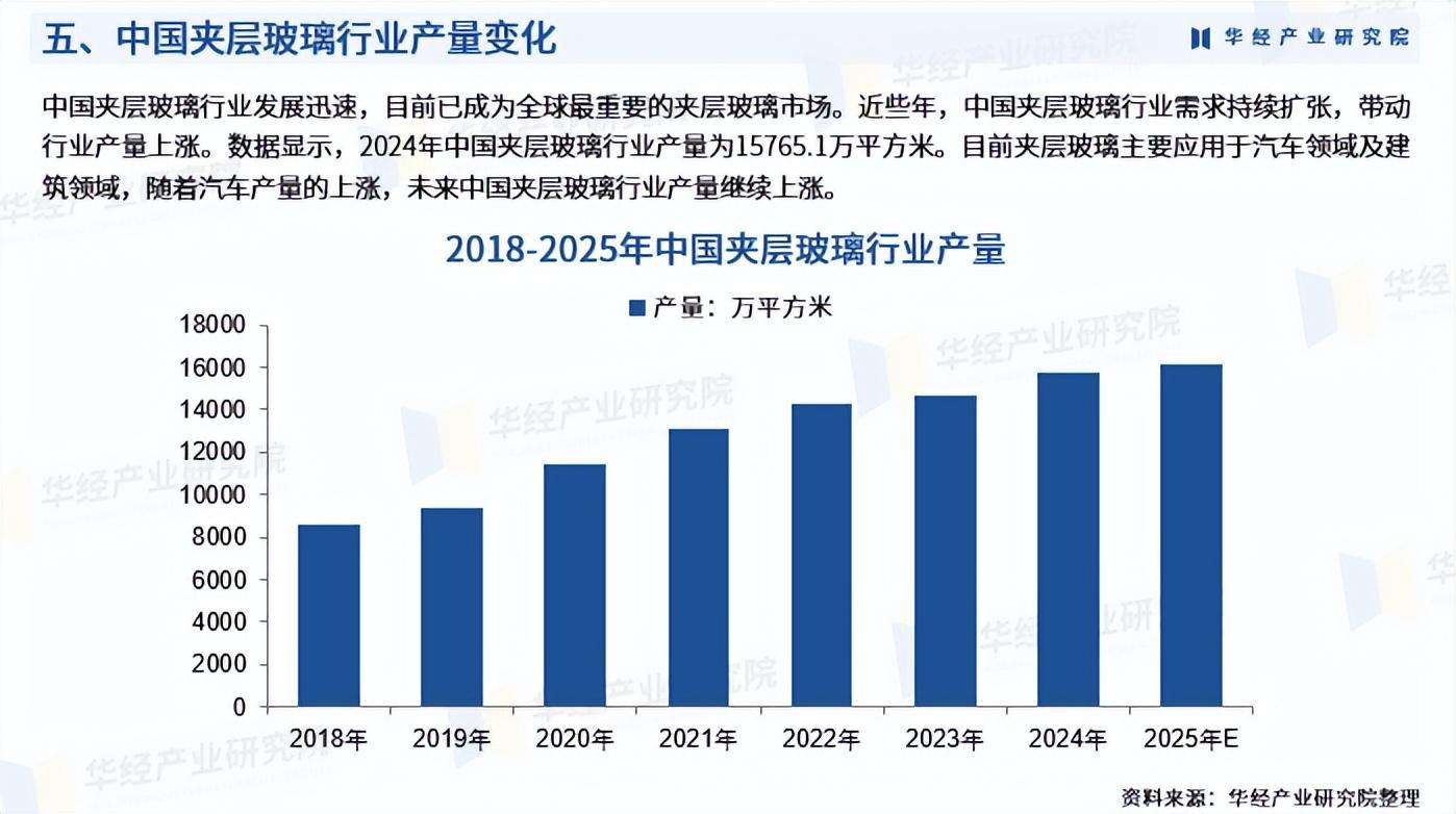 中国夹层玻璃行业发展迅速,目前已成为全球最重要的夹层玻璃市场。近些年,中国夹层玻璃行业需求持续扩张,带动行业产量上涨。数据显示,2024年中国夹层玻璃行业产量为15765.1万平方米。目前夹层玻璃主要应用于汽车领域及建筑领域,随着汽车产量的上涨,未来中国夹层玻璃行业产量继续上涨。