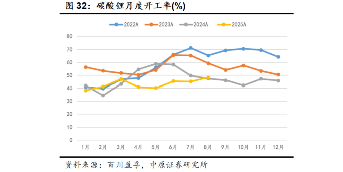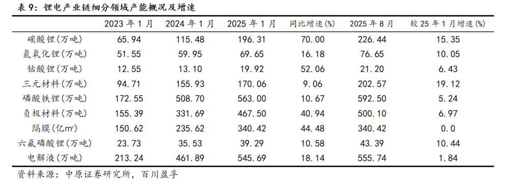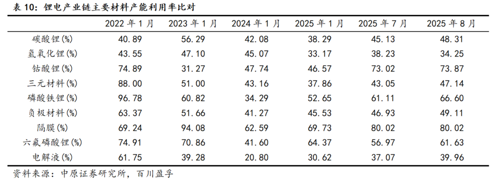 2025年以来,碳酸锂高度相关材料价格仍承压,但跌幅较2024年将趋缓,价格承压的主要逻辑在于:一是锂电产业链细分领域产能持续释放,行业产能总体仍过剩。受行业高景气度影响,2023年以来锂电产业产能扩张显著提速,新增产能持续释放,锂电材料细分领域开工率总体位于较低水平。如2025年1月碳酸锂产能超196万吨,同比增长70%;2025年8月进一步提升至226.44万吨,环比2025年1月增长15.35%。2025年1月负极材料产能467.5万吨,同比增长40.94%;2025年8月为500.1万吨,环比2025年1月增长6.97%。2025年1月,碳酸锂、氢氧化锂、三元材料和电解液开工率均在40%以内;但2025年8月开工率较1月开工率有所提升,其中碳酸锂、钴酸锂、三元材料、磷酸铁锂、隔膜等提升较为显著,且大部分细分产品环比7月开工率总体提升,如磷酸铁锂环比提升5.49个百分点、六氟磷酸锂环比提升4.66个百分点。结合锂电池板块在建工程,2025年仍有产能将释放,预计细分领域行业产能短期难以出清。但部分细分领域产能增速放缓,如隔膜和电解液。二是碳酸锂上游原材料价格总体持续下降。我国矿石提锂所需锂矿价格主要来自澳洲和非洲,其中非洲锂矿价格相对较低且进口总持续增长,锂矿价格总体下降。三是需求增速与产能扩张速度不匹配,锂电池属于国家新质生产力范畴且长期发展前景确定,但短期行业需求与产能扩张错配。四是库存因素。结合我国动力电池和其他电池产量、我国动力电池装机量,以及我国动力电池和其他电池出口情况,我国动力和其它电池存在一定的库存。五是海外政策不确定性影响。海外贸易壁垒短期对我国锂电池需求有影响,其中美国关税政策仍存在一定的不确定性。综上,多因素共振导致产业链价格总体仍承压,其中产能持续释放是产业链价格承压最主要因素,但不同企业产能利用率差异显著,其中长期注重研发投入、产品走差异化路线企业的产能利用率在细分行业较高,其市场占比有望持续提升,建议重点关注。