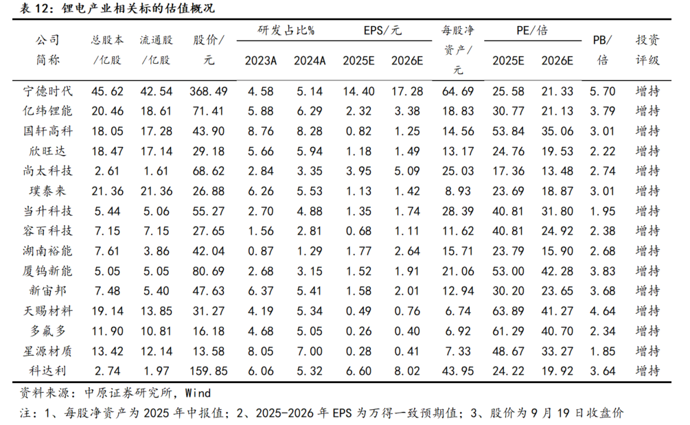 维持行业“强于大市”投资评级。截至2025年9月19日:锂电池和创业板估值分别为29.11倍和45.05倍,结合行业发展前景和估值水平,维持行业“强于大市”评级。结合锂电池行业发展趋势、国内外新能源汽车行业发展特点、锂电产业链价格走势以及细分领域业绩概况,建议持续围绕三条主线布局。
