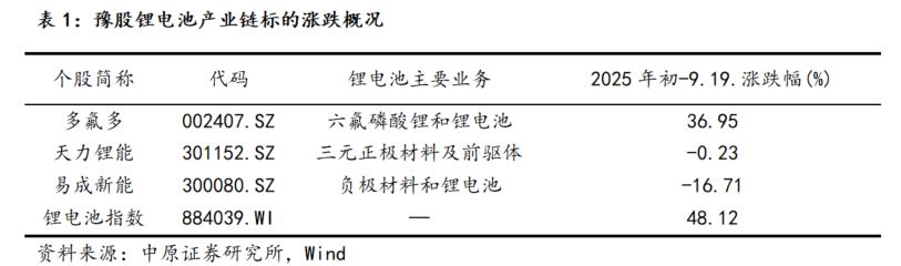 2025年锂电池指数强于沪深300指数。2025年以来,锂电池指数走势总体强于沪深300指数,截至9月19日锂电池指数上涨48.12%,跑赢沪深300指数33.71个百分点;豫股锂电池标的走势强于板块指数。