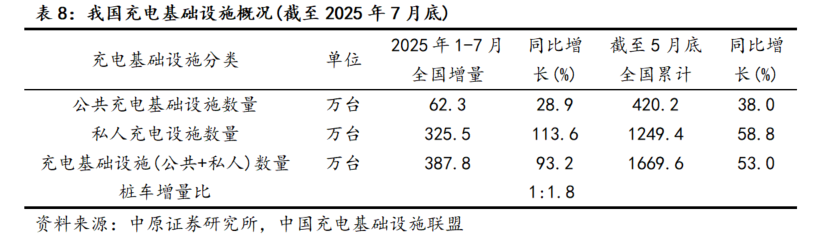 根据中国充电基础设施联盟统计:2025年1-7月,全国充电基础设施新增387.8万台,同比增长93.2%,充电基础设施与新能源汽车继续快速增长;桩车增量比为1:1.8,充电基础设施建设能够基本满足新能源汽车的快速发展。截至2025年7月,全国充电基础设施累计数量为1669.6万台,同比增长53.0%。2025年7月全国充电总电量约77.1亿度,较上月增加10.0亿度,同比增长53.9%,环比增长14.9%。