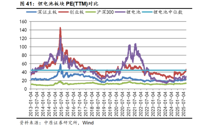 根据万得数据统计:2021年锂电池和创业板估值均值分别为85.20倍和51.10倍,且锂电池板块估值见顶后总体持续回落;2022年均值分别为43.34倍和39.47倍倍;2023年均值分别为19.14倍和34.74倍;2024年均值分别为19.64倍和30.32倍。截至2025年9月19日:锂电池和创业板估值分别为29.11倍和45.05倍。2022年以来。目前锂电池板块估值显著低于2013年以来44.29倍的行业中位数水平。基于行业政策、新能源汽车行业发展前景、锂电池板块业绩增长预期及估值水平,维持锂电池行业“强于大市”投资评级。