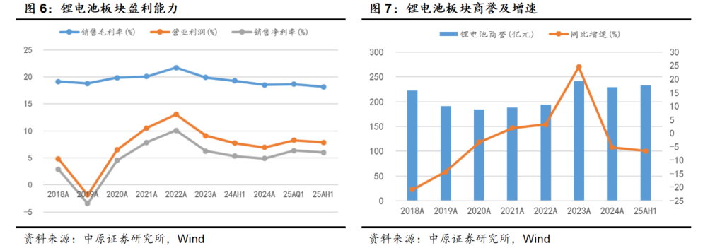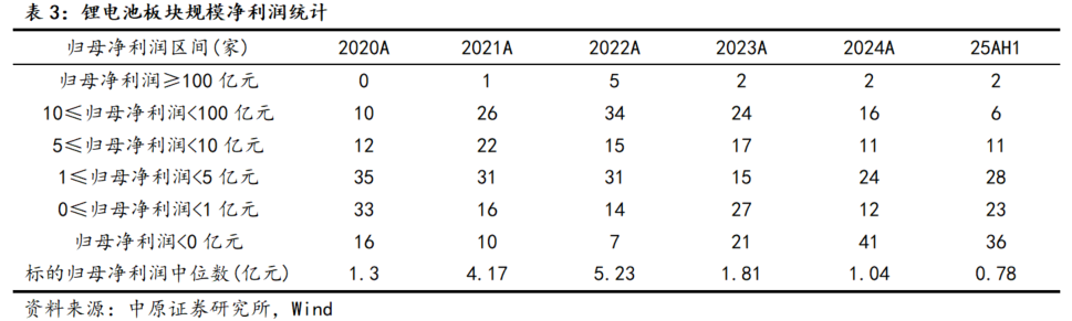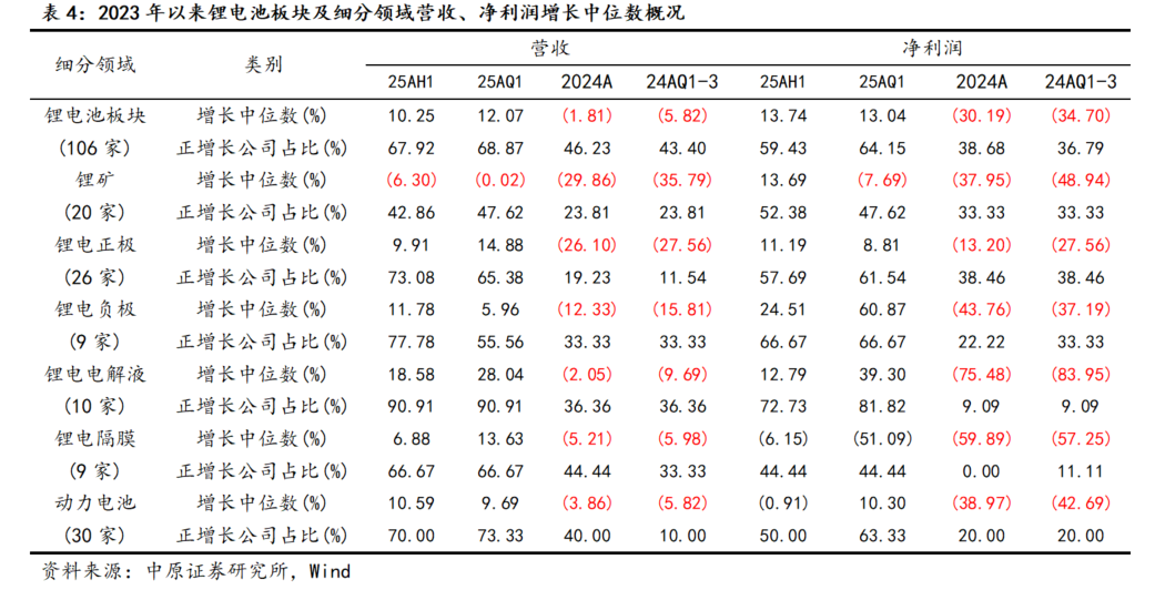 三是锂电池板块净利润增长中位数和正增长占比2025年以来显著改善。2024年三季度到2024年底,板块净利润增长中位数总体变化不显著,在-30%附近波动,净利润正增长公司占比也维持在37%附近;2025年以来,板块净利润增长中位数止跌转正,2025年上半年正增长公司占比大幅提升至59.43%,但环比一季度的64.15%小幅回落。
