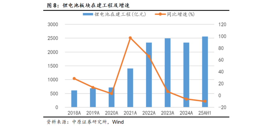 在建工程显示:2018-2020年总体波动较小,2021年以来板块在建工程大幅增加,2021和2022年增速维持在高位;2022-2024年总体波动变小。2024年上半年,板块在建工程为2837.70亿元,为近年来的最高值;2024年为2337.79亿元,同比下降6.12%;2025年一季度为2510.68亿元,同比下降8.17%,但环比2024年增长7.39%;2025年上半年在建工程环比一季度小幅增至2558.67亿元,同比下降9.83%,显示行业细分领域仍处于产能扩张中。